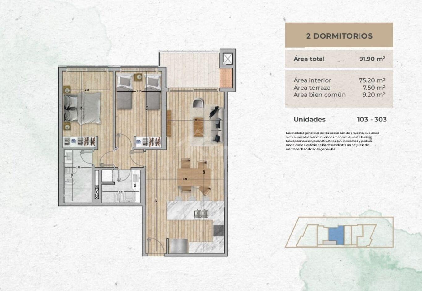 El apartamento cuenta con 75m2 interiores y 7,5m2 de terraza con parrillero propio!Está dispuesto al lateral del edificio con una vista despejada con orientación este que lo hace muy luminoso!