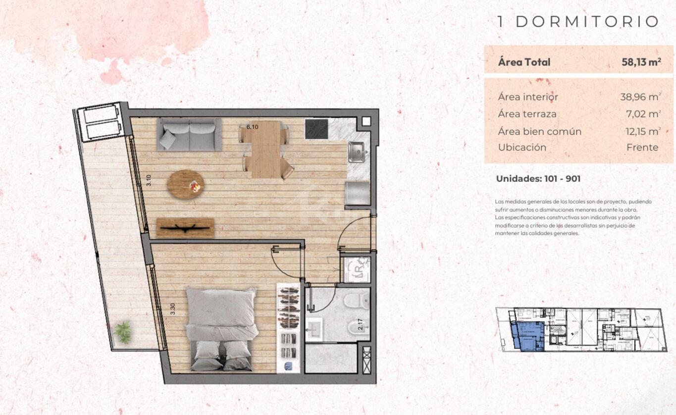 Apartamento en pozo, piso 9, de 1 dormitorio en Pocitos Nuevo!Además cuenta con 1 baño, living-comedor con cocina integrada y un amplio balcón!