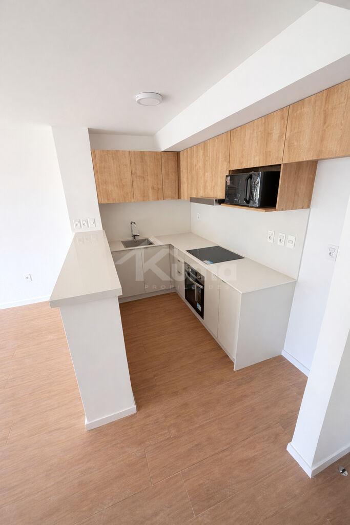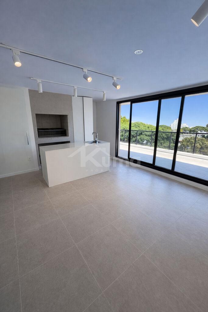 Al entrar al apartamento sobre la derecha se encuentra la cocina integrada a través de una barra living comedir con salida al balcón con vista al jardin del Edificio.